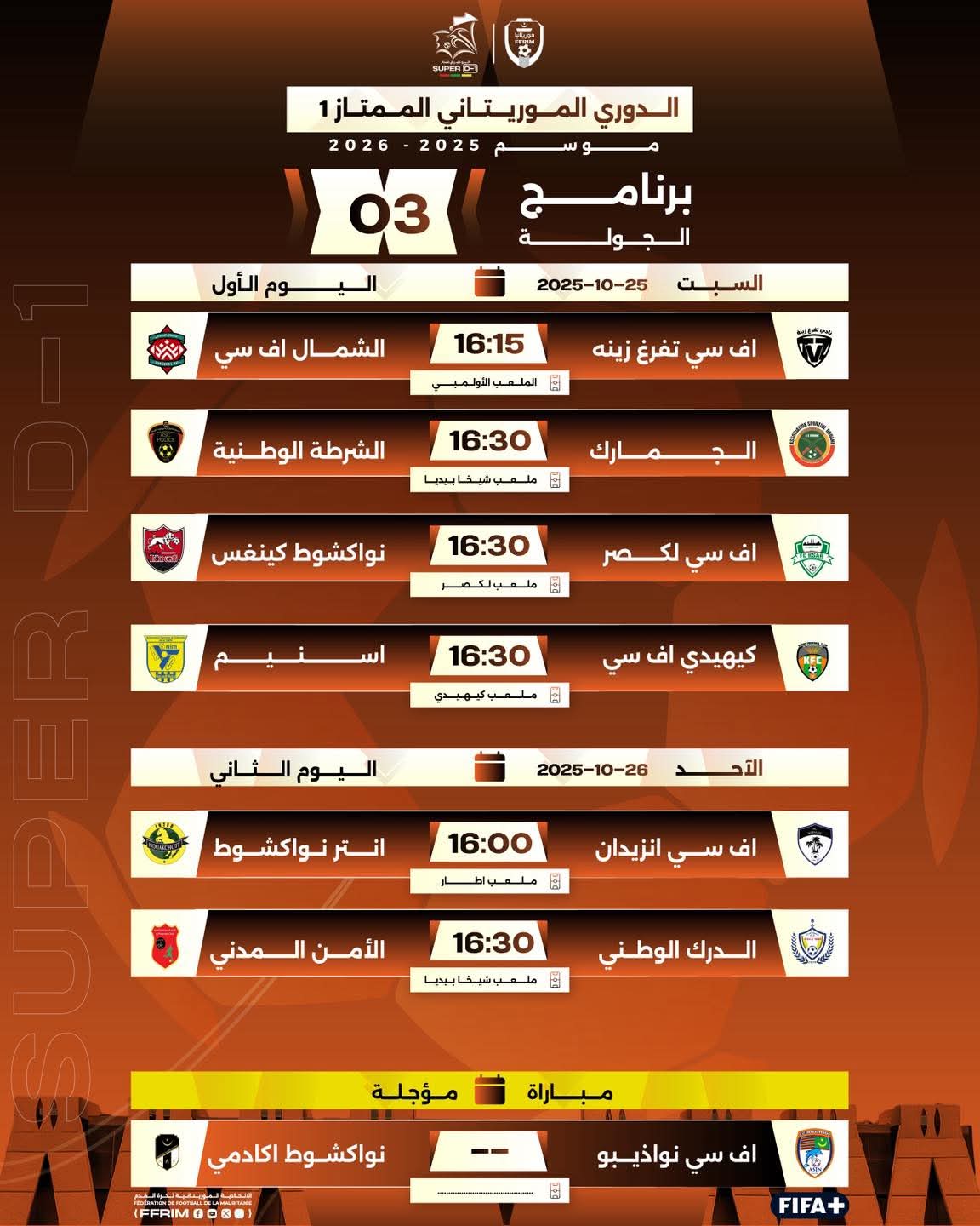 الأخبار(نواكشوط) – في أعقاب جولة ثانية شهدت مواجهات مثيرة ونتائج متقلبة، تم الإعلان رسميًا عن برنامج مباريات الجولة الثالثة من منافسات الدوري الموريتاني الممتاز “سوبر 1” للموسم الرياضي 2025-2026، والمقرر إقامتها يومي السبت والأحد 25 و26 أكتوبر 2025.