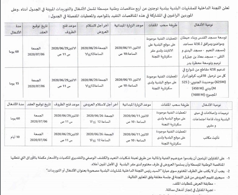الأخبار (نواكشوط) ـ أعلنت لجنة المشتريات البلدية ببلدية توجنين عن أربع مناقصات مفتوحة أمام المهتمين، على أن يتم فتح العروض بعد شهر من الآن.