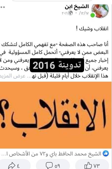 ورغم أن النص كان طافحا بالعبارات التي تحيل إلى المقصود بأسلوب يقرب من التصريح، كعبارة “الأفق” ، وعبارة “ليس كالانقلابات التي تعودنا عليها” وعبارة “على أعلى المستويات” وعبارة “لا تستطيع أي قوة أن تتصدى له” وعبارة “سيكون بردا” ، رغم كل ذلك يبدو أن الجهات “الأمنية” قد تحسست من تلك التدوينة، حيث تلقيت بعدها عدة اتصالات من أشخاص قدموا أنفسهم كعناصر تابعة لإدارة الأمن وأبدوا امتعاضهم من تلك التدوينة !!