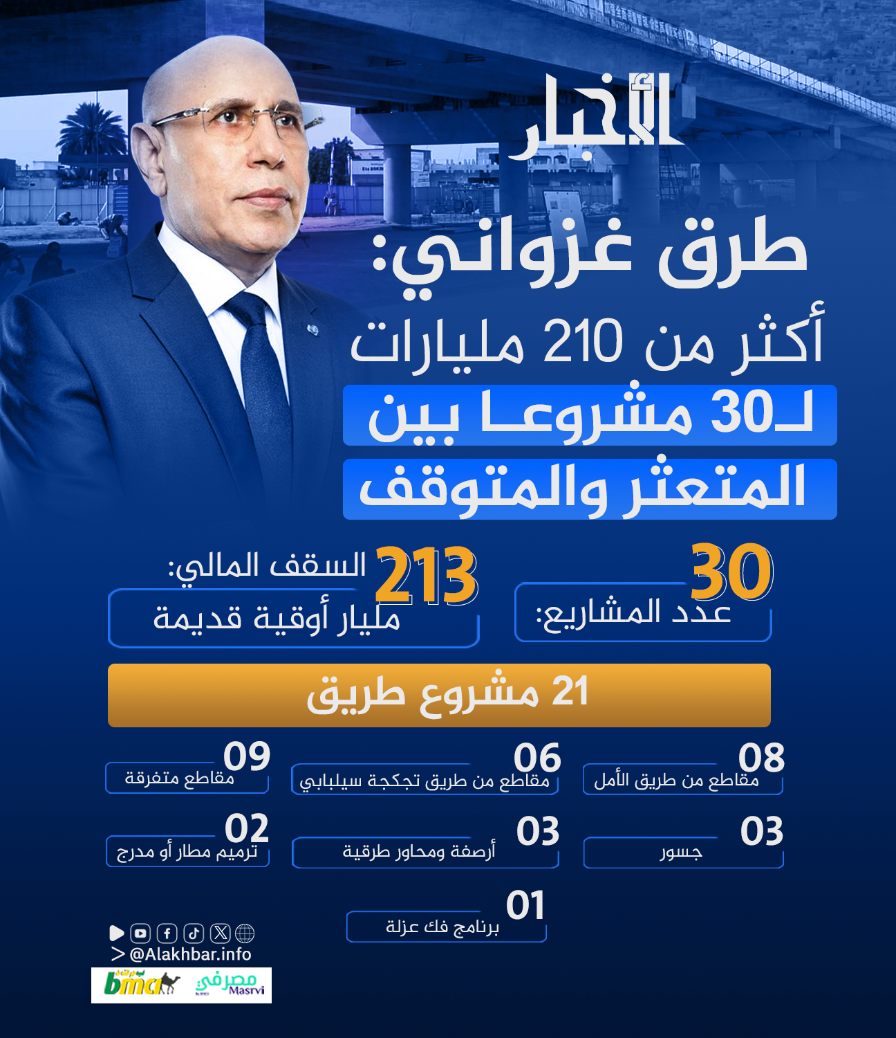 الأخبار (نواكشوط) – كشفت إحصائية أعدها فريق من وكالة الأخبار المستقلة تخصيص حكومات الرئيس محمد ولد الغزواني – خلال مأموريته الأولى – أكثر من 210 مليار أوقية قديمة للطرق، أو لمشاريع مرتبطة بها، لكن واقع هذه المشاريع يتراوح بين التعثر والتوقف بشكل نهائي.